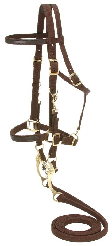Complete with reins and standard curb bit, ready to ride, this bridle/halter combination is made of strong, poly nylon completely adjustable and washable. 7' single ply reins and stitched throughout.