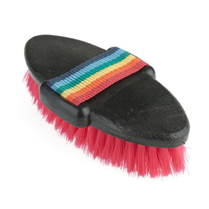 This large body brush is designed with a durable plastic back and a reinforced rainbow nylon hand strap that makes it easy to stay on your hand and not end up on the ground. Colorful bristles with an inner white core makes this easy to find in your grooming tote. Gently removes surface dirt and dust. Comfortable, easy grip.