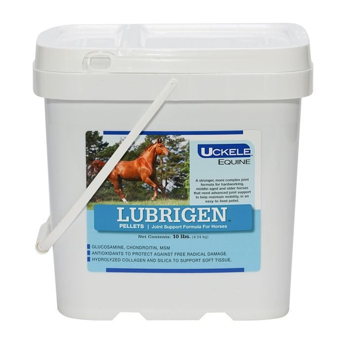 Uckele Lubrigen™ Pellets are formulated with antioxidants and herbal extracts to provide a complex joint support for hardworking horses. This go-to supplement delivers proactive joint support for the young or heavily worked horse to maintain strong bones, joint mobility, synovial fluid, and structural integrity and function. It starts with Glucosamine and Chondroitin Sulfate, the most fundamental joint support ingredients, and adds 13 additional ingredients to help support the structural integrity of joints, connective tissue, and healthy joint fluid viscosity. Lubrigen is excellent for horses with existing joint challenges, and may provide support as a precautionary measure.