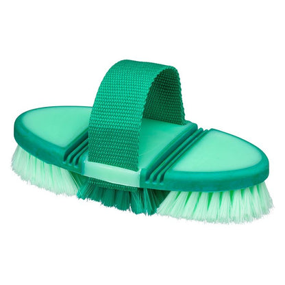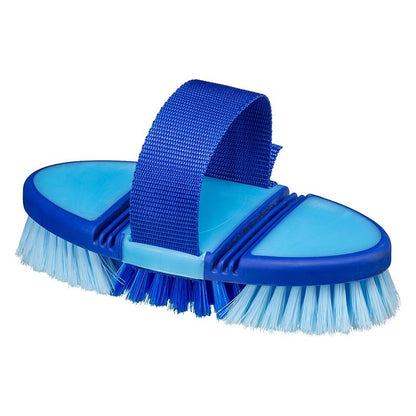 The adjustable hand strap keeps the brush firmly and comfortably in your hand. This brush flexes at two points, allowing the brush to fit the contours of the horses body. This is the perfect brush for legs!