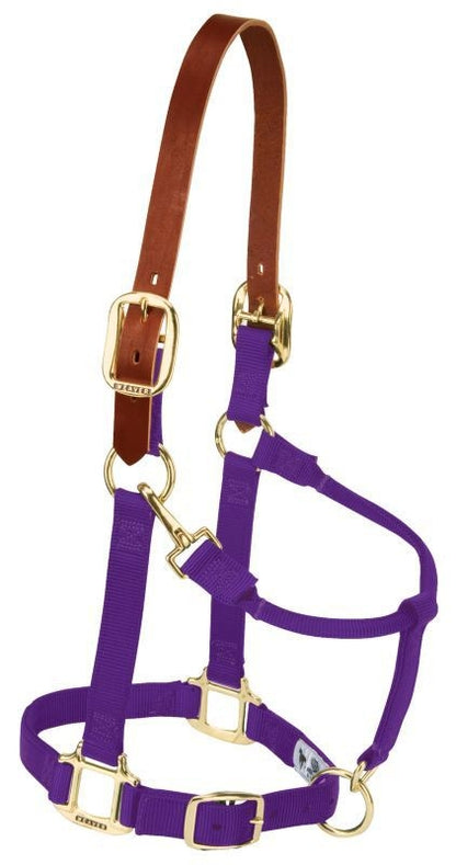 A soft, supple burgundy latigo leather crown is the perfect addition to our popular original nylon halter. This convenient breakaway halter features a 3/4" nylon construction, oblong buckle holes, box-stitching at stress points and true-to-fit sizing. Also features brass plated double crown buckles and a sewn-in, non-rust solid brass throat snap. Weanling/pony size.